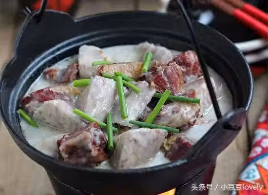 放入芋頭塊翻炒均勻,倒入椰汁,撒上胡椒粉攪勻後倒入砂煲中,大火煮沸後轉小火煮15分鐘至芋頭熟透,撒上蔥段即可。