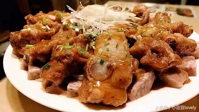 鍋中加水燒開,芋頭鋪在盤子底部,上面鋪上京蔥,把排骨均勻碼放在最上層,蓋蓋子大火蒸25分鐘。