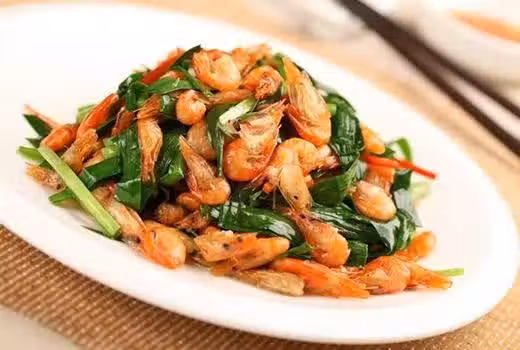 250克河蝦、1小把韭菜、鹽、油、薑絲、料酒。