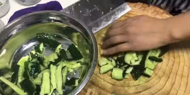第八步:10分鐘後倒出黃瓜中腌制出來的水分。