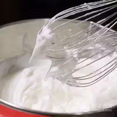 7、最後一次糖加入後,將打蛋器調至低速攪拌,一邊打一邊順時針轉動打蛋盆,直到提起打蛋頭呈直角尖的狀態,蛋白就打發好了。