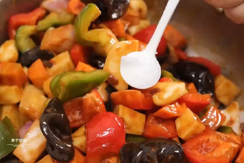 8、放入適量的鹽,不用太多,因為醬汁已經有鹹味了,喜歡吃辣的朋友可以放點辣椒粉