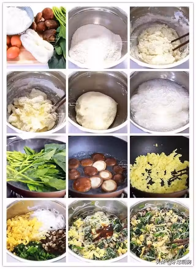 第十步:焯好的菠菜擰乾水分,切成1厘米左右的段。香菇擰乾水分,切成丁。泡發好的粉絲,切成2厘米左右的段。然後把這些與雞蛋一起放入盆中,再放入少許薑末、蔥末,如圖。