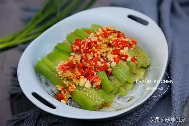 第一步:準備食材。絲瓜2根、粉絲1把、蒜適量、剁辣椒適量、香蔥少許。