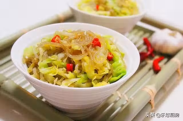 第一步:準備食材。圓白菜半個、粗粉絲適量、紅辣椒適量、蒜適量。調味料有:食用油適量、鹽適量、雞精適量、醋適量、香油適量。
