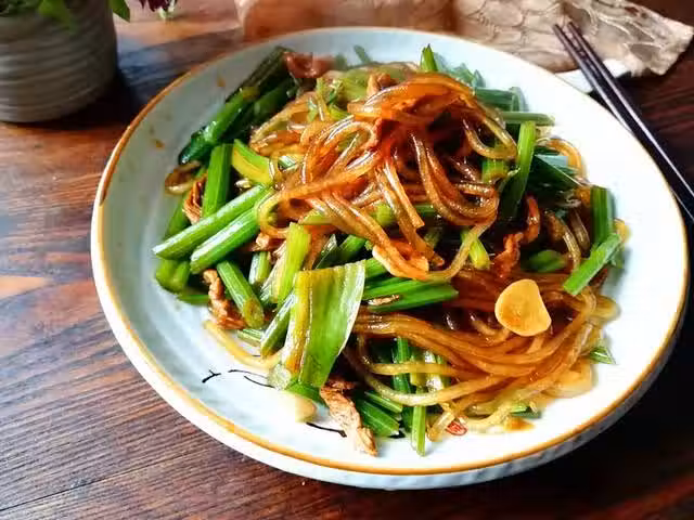 材料:芹菜500克、粉條1把、豬肉100克、油鹽適量、蔥1段、姜2片、大蒜2瓣、醬油2湯匙、料酒1湯匙、