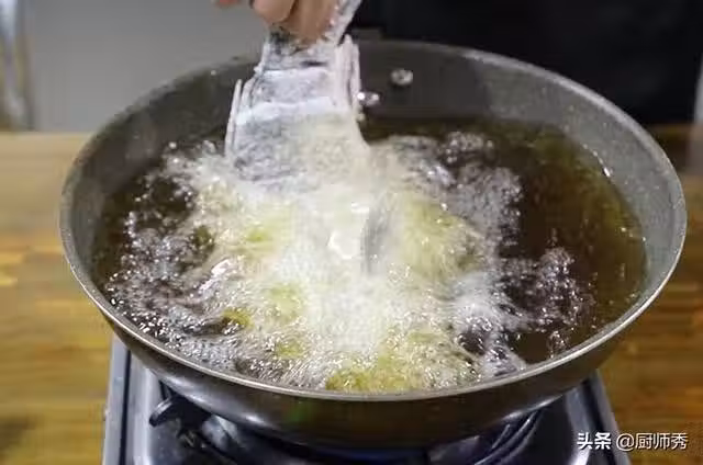 5、下入鯉魚的時候,要兩面翻動下,讓魚肉花刀都能舒展開,防止粘連再一起,然後整個的下入鍋內炸制,並不斷的用勺子往魚身淋油,因為鍋小等魚定型之後,用勺子托起來魚,讓魚尾浸炸一會。