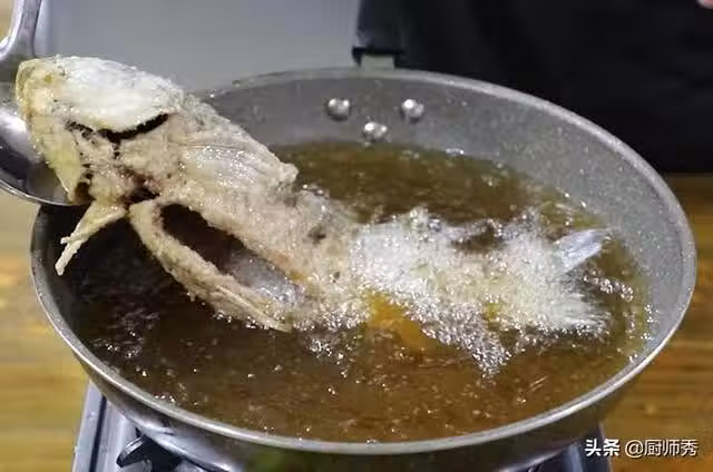 6、把魚尾炸熟透定型,炸魚時間是6-7分鐘,中間要一直大火,炸制鯉魚漂浮定型,然後用笊籬撈出控油,這個時候鯉魚就炸好了,下面開始燒魚。