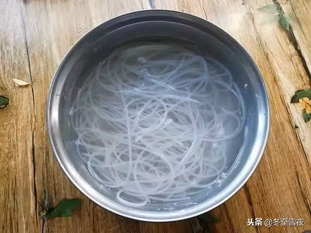 1.將粉條提前放在盆內,淋入開水,將粉條燙軟,然後在溫水中浸泡2-3小時,將粉條泡發至無硬心,泡發的時間要長些,使粉條吸收足夠的水分。