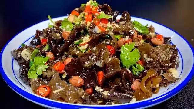 1、提前一晚泡發好黑木耳,再加清水稍微抓洗幾下即可。鍋中水開倒入木耳煮兩分鐘,將木耳煮熟後即可撈起瀝干。放入碗中,再加入紅辣椒,大蒜末,再澆上熱油激發出香味。