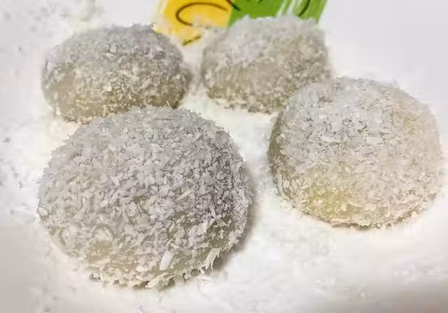 取出蒸好的糯米糰子,滾動在花生粉或椰絲中,均勻地裹上一層外衣。