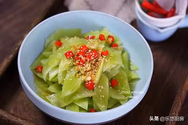 第一步:準備食材。萵筍一根,提前去掉老根和外皮。蒜適量、紅小辣椒適量。
