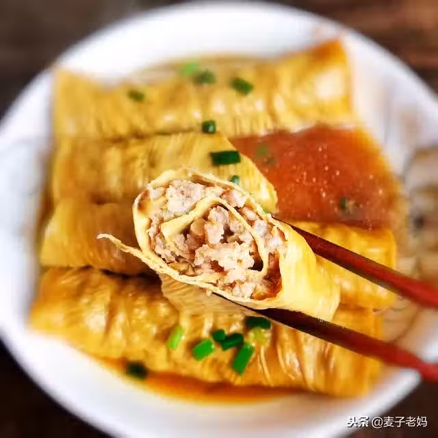 做法:1、豬肉泥放入碗中,加點料酒、鹽、白鬍椒粉、生抽、雞粉拌勻;2、榨菜絲切小,放入拌好的肉泥中,再次拌勻;3、干豆腐皮放入水中浸泡發軟;4、把泡軟的豆腐皮切成4張;5、取一張豆腐皮,均勻鋪上榨菜肉餡;6、慢慢捲起來,盡量卷緊點;7、把豆腐皮肉卷放入碗中,上鍋蒸15分鐘;8、時間到,把蒸出的汁水倒回鍋中,加點生抽、鹽、澱粉、蔥花調了澆汁;9、把汁水淋在蒸好的豆腐皮肉卷上