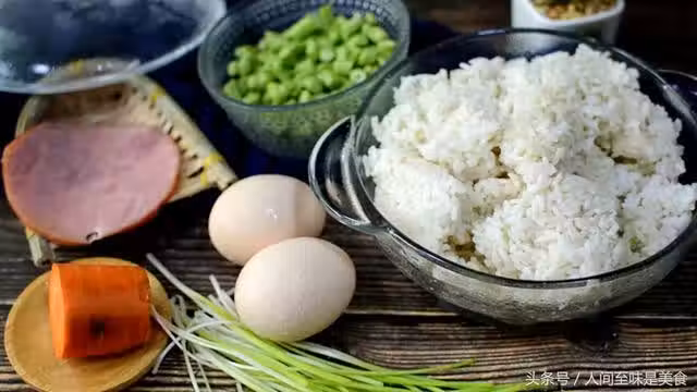 先把火腿、胡蘿蔔、豆角、香蔥切成丁備用。