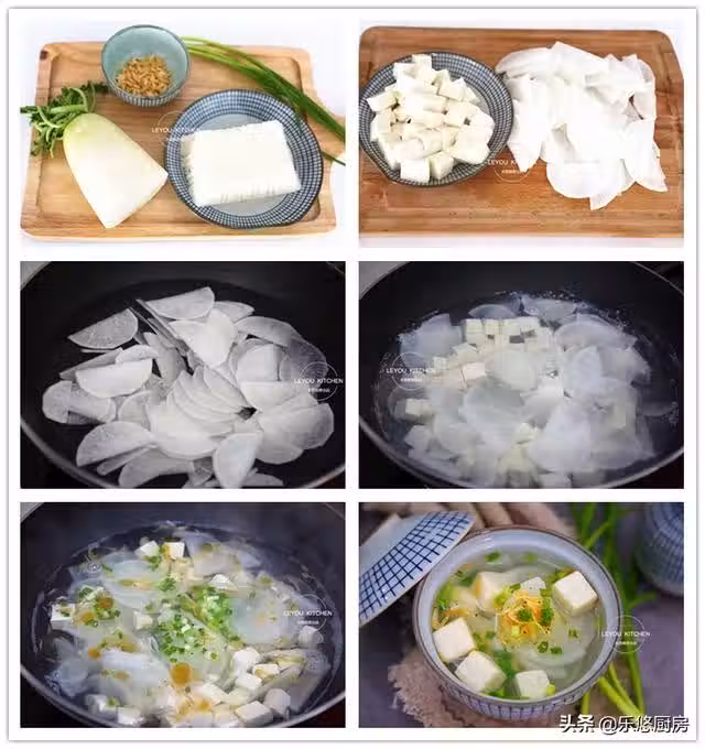 做法:白蘿蔔去皮後切成片,豆腐切塊,香蔥切末備用。鍋中倒入一大碗清水,把白蘿蔔放入鍋中,煮到變軟,然後把豆腐放入鍋中,煮1-2分鐘,接下來把蝦皮放入鍋中,最後調味,往鍋中放入1勺鹽,少許雞精,小半勺白鬍椒粉,幾滴香油,一把香蔥末攪拌均勻即可關火。