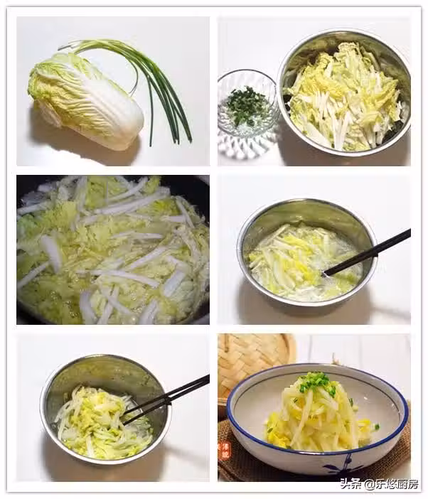 第五步:開始調味。往白菜中放入1勺鹽、半勺雞精、2勺白糖、3勺白醋、幾滴香油,拌勻後裝盤,裝好盤再撒少許香蔥末裝飾即可。(如果想口感更加清爽,可以放到冰箱冷藏十幾分鐘)