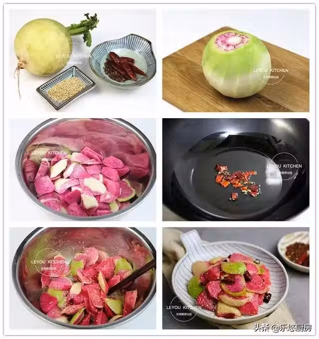第四步:鍋中倒入少許油,油熱後把干辣椒和花椒放入鍋中煸出香味。然後關火,將熱油連同辣椒和花椒一起倒入蘿蔔中。