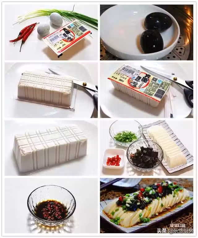 第六步:將蒸好的皮蛋切塊、豆腐切片、香蔥切末、辣椒切段備用。
