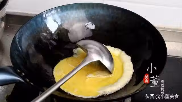 3、鍋中倒油,油熱之後倒入雞蛋液,炒熟後盛出備用;