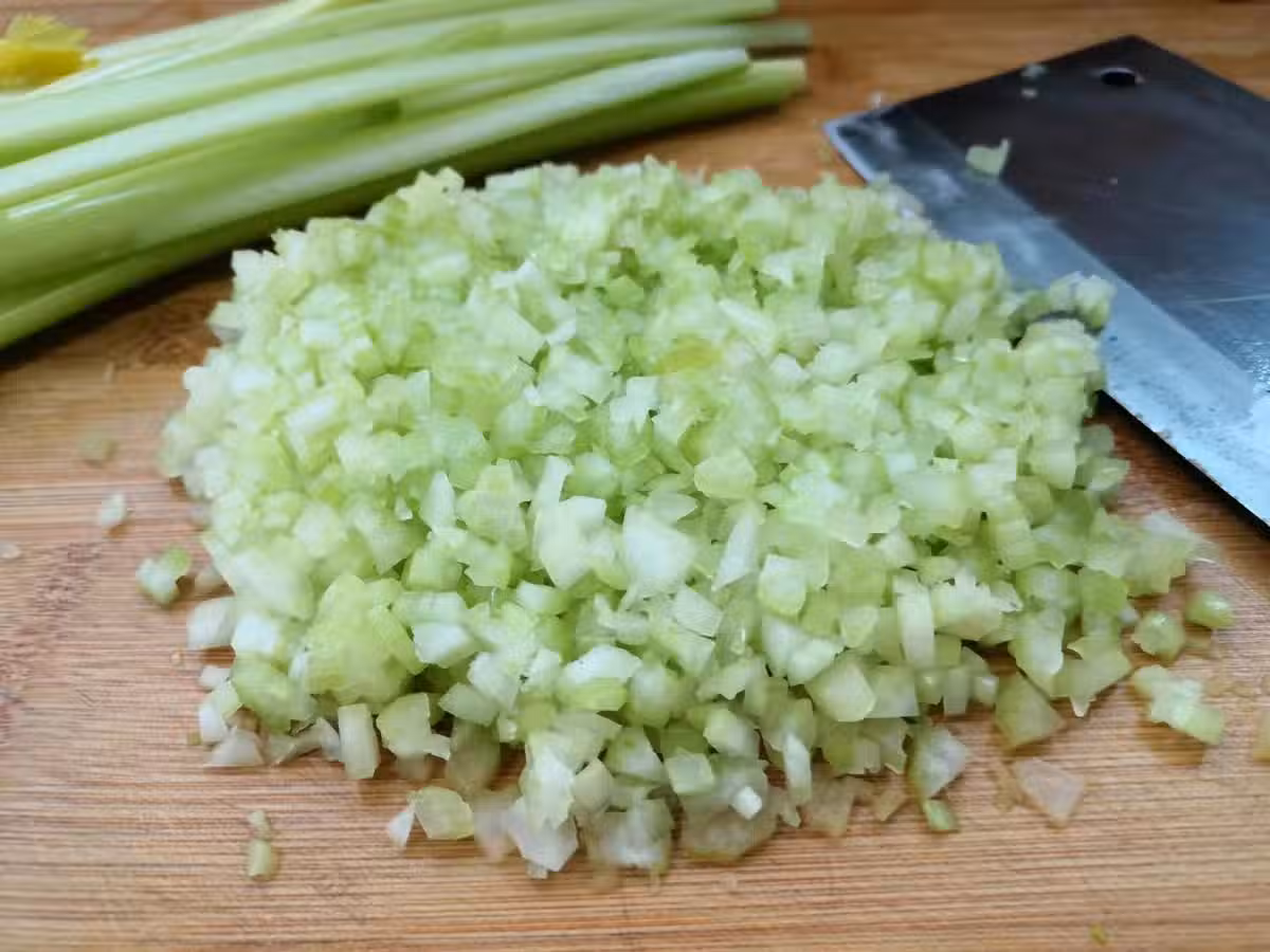 2、鍋加水水開以後倒入芹菜丁,焯水後吃起來會更加的嫩。焯水大概2分鐘,撈出放在涼水中投涼,裝入紗布中,擠干水分待用。