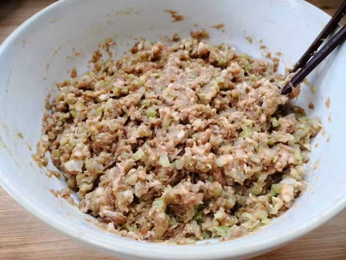 9、取一張餃子皮攤開在手心,把調好的芹菜豬肉餡放在餃子皮中間,根據自己包餃子的習慣,把餃子逐個包好。