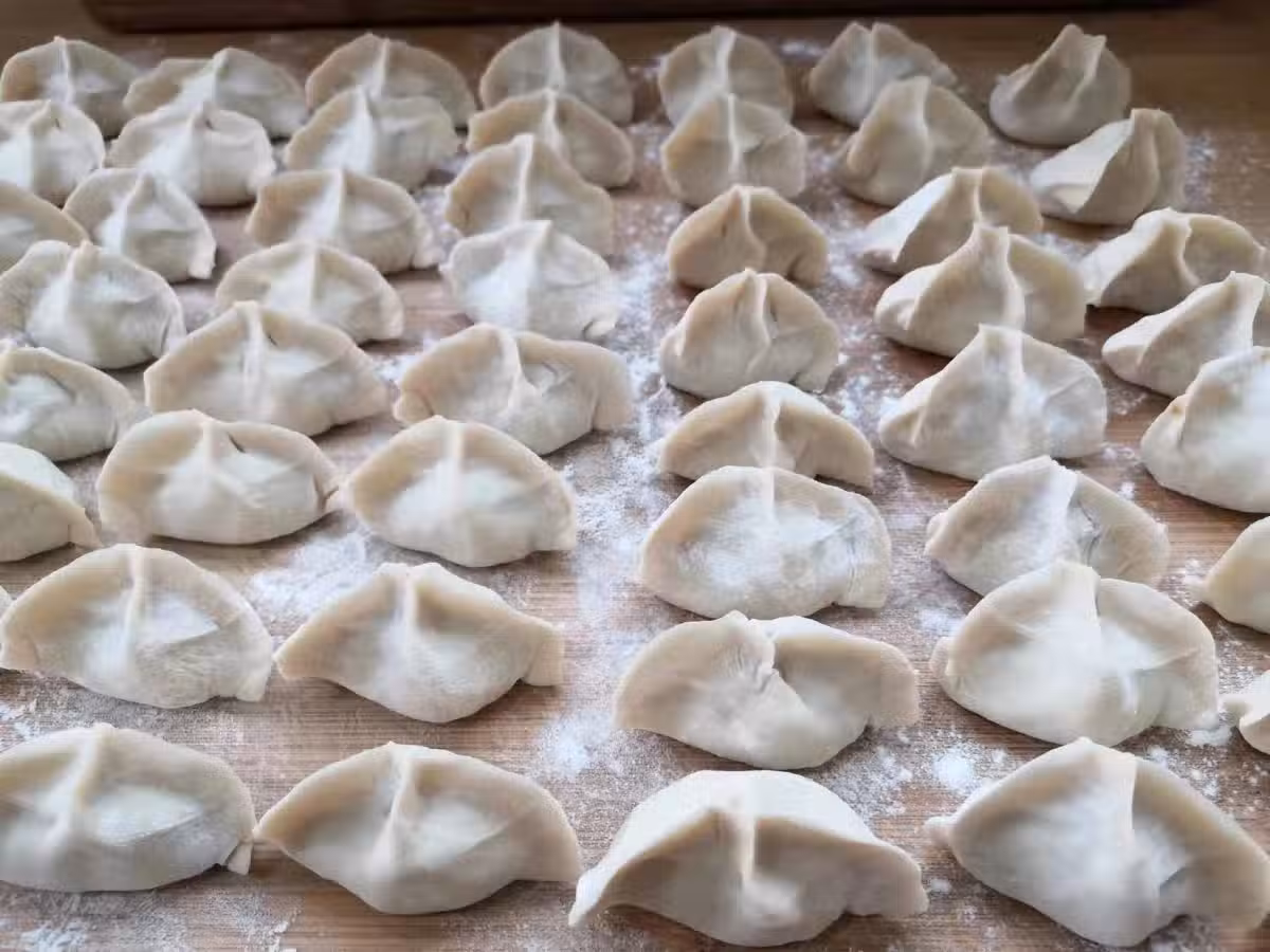 10、 鍋中水開下入餃子,用鏟子沿著鍋邊輕輕攪動,以防粘連,煮餃子的時候點3次冷水,煮到餃子上浮,裡面的餡料就算是熟透了,這時候撈出來就可以啦,直接吃或者蘸蒜醋辣椒汁食用,太香了。