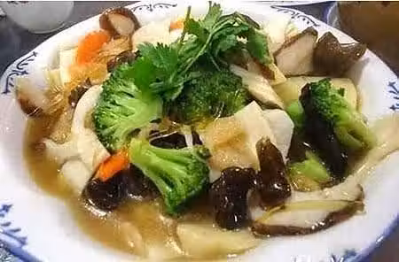 原料:150g西蘭花、25g香菇、油、鹽、蘑菇精適量