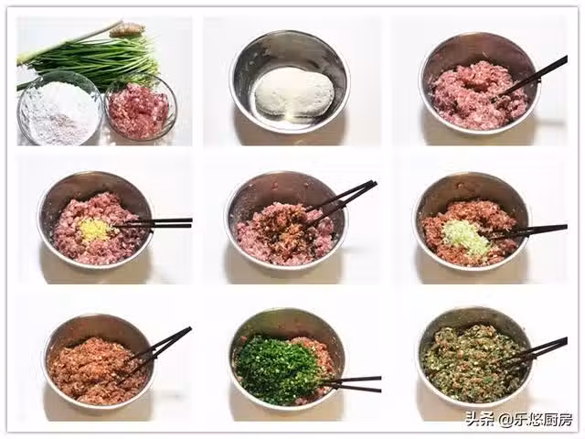 第六步:蔥切末放入肉餡中。