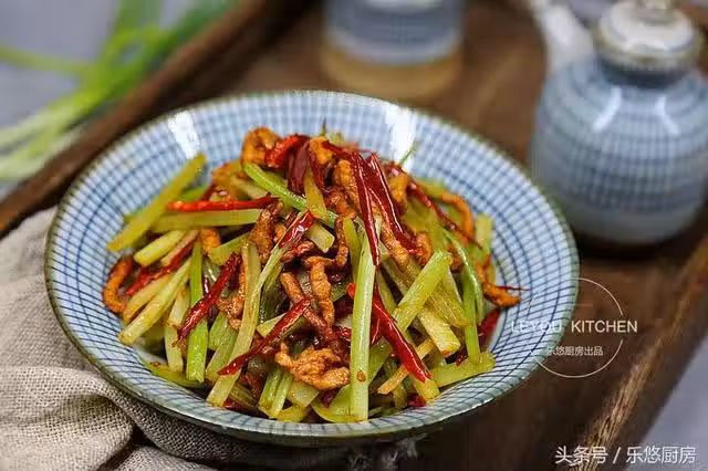 第一步:準備食材。豬裡脊肉200克、芹菜300克、干辣椒適量、花椒粉少許、姜適量、蒜適量。