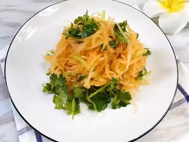 5. 把擠干水的蘿蔔絲放入大盆里,加醋、鹽、蔬果粉拌勻