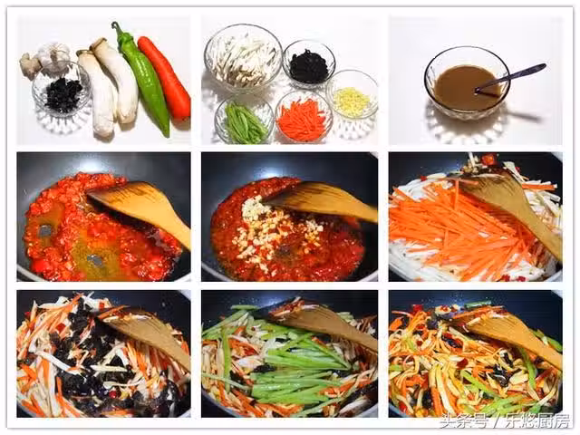 第六步:將杏鮑菇和胡蘿蔔絲放入鍋中煸炒1分鐘。