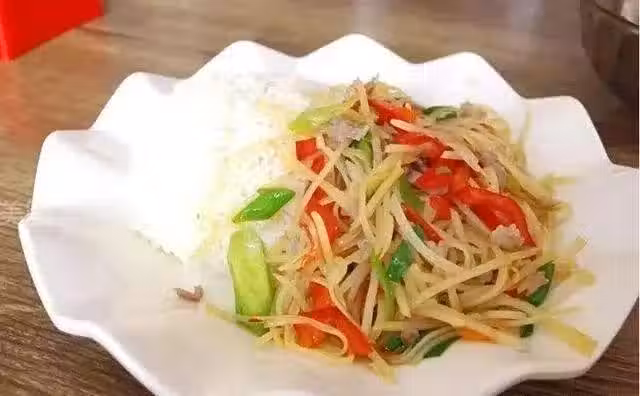 1.將青椒和土豆切絲,鍋中放油,放入鍋中翻炒,土豆變色後盛出。2.鍋中加油,放入火腿翻炒,然後將炒好的土豆絲放入,加入適量的鹽和醋。拿一個碗,將炒好的土豆絲放在碗底,將煮好的米飯放在上面,壓平拿一個碟子,碗倒扣,將碗拿掉即可。