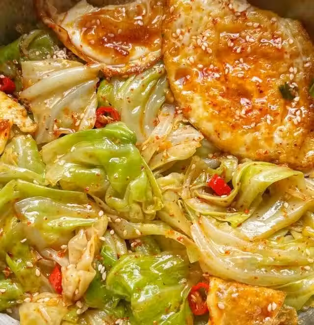 包菜撕成小塊煮熟撈出,煎兩個溏心荷包蛋放上面,最後淋上醬汁拌勻就可以啦!