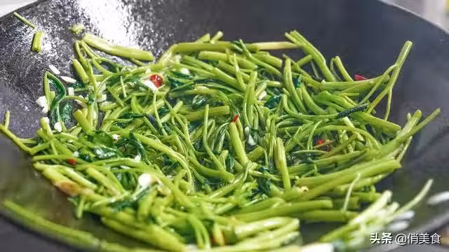 6、空心菜千萬不要炒的時間長了,開大火最多2分鐘就熟了,炒的時間久了就軟了,口感不夠爽脆並且還容易發黑。