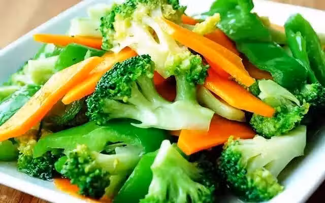 第三步,然後鍋中放油,放入準備好的,西蘭花和胡蘿蔔片。放鹽,雞精,味精。翻炒均勻出鍋。