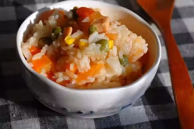 胡蘿蔔去皮後切丁、玉米剝粒、青豆沖洗乾淨,火腿腸切丁、番茄洗乾淨去蒂。大米淘好後加入適量水,水比平時蒸米飯時少一點點,因為番茄會出很多湯汁。