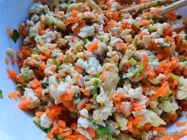 4.把炒好的雞蛋放在盆內,加入豆腐,胡蘿蔔,蔥薑末,加入剛才盛出煉好的熟油,再加入鹽,蚝油,十三香,用筷子攪拌均勻,撒入蒜苗,攪拌均勻即可,這樣包子餡就調好了。