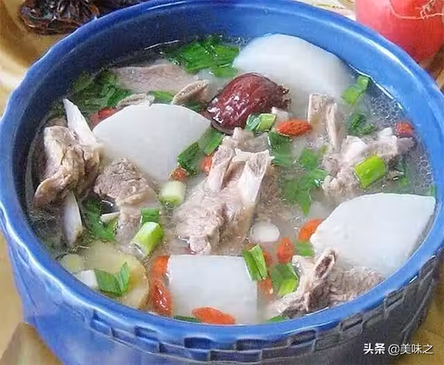 羊排骨750克、白蘿蔔500克、白蘿蔔50克、青蒜50克、枸杞適量、姜適量、蔥適量、桂皮適量、紅棗適量、鹽適量、料酒適量、胡椒粉適量、雞精適量。