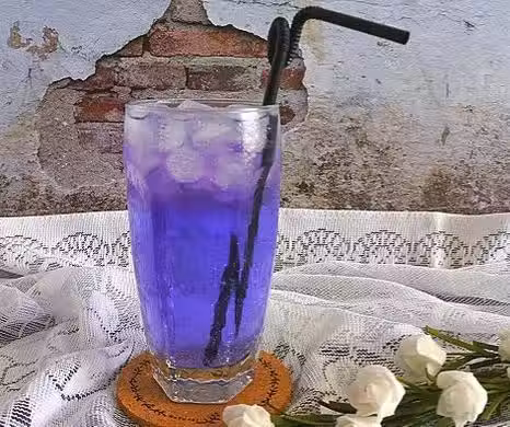 步驟4:杯子裡放滿冰塊,倒入2/3杯的蝶豆花糖水,擠入少量檸檬汁,讓在最上面的那一層變成紫紅色。