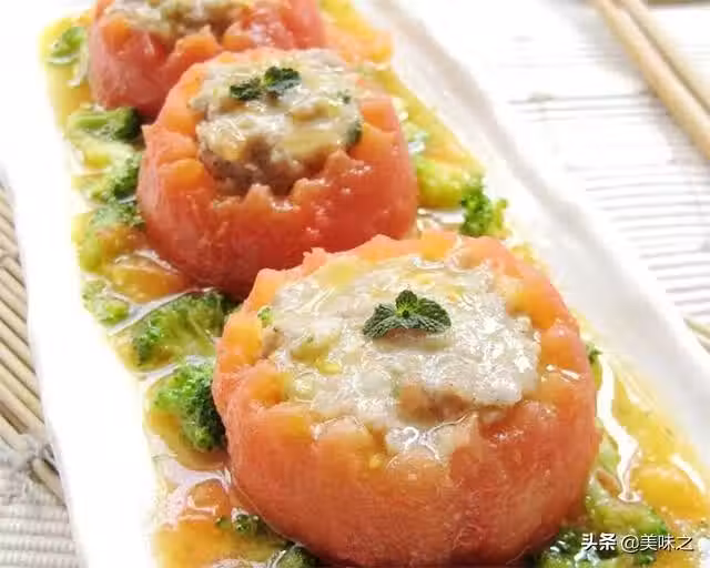8、將蒸好的番茄放在上面,再將剩餘的1/3西蘭花番茄汁澆在上面即可。