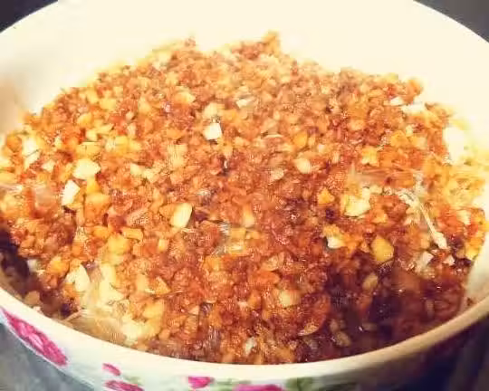 用適量的油炒蒜末至金黃色。慢慢炒,別著急。最後加一勺蒸魚豉油炒勻後出鍋。