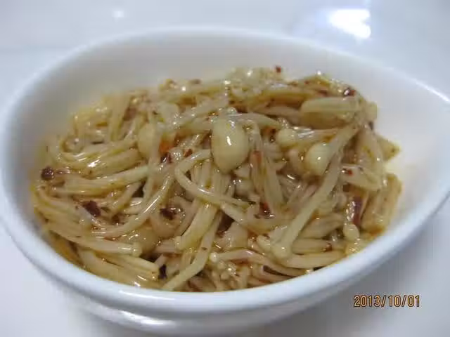 金針菇用刀切去根部大約1寸長度洗凈焯水1分鐘放涼水中浸泡擠去水分用鹽味極鮮辣椒油拌勻即可