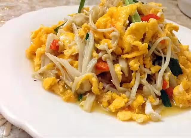 瀝掉部分金針菇的湯汁,將金針菇倒入鍋內跟雞蛋一起稍稍翻炒。放蔥段,加鹽和雞精翻炒均勻