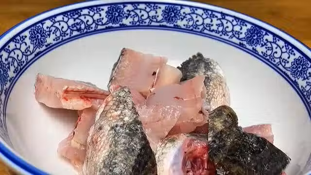 3.魚肉的上面會有一排大刺,把刀貼著魚刺的地方片下來,切成小塊和魚骨放在一起,然後放進一個大碗中,加入清水清洗乾淨,洗凈後後撈出來放進大碗中。加入適量黃酒,沒有黃酒也可以用啤酒,再加入1勺鹽、適量白鬍椒粉,抓拌均勻腌制 20分鐘。