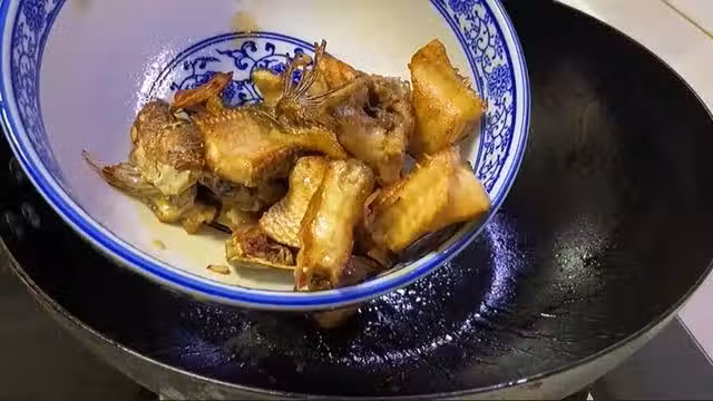 8.鍋中再加入一勺底油,油熱後把蔥段、姜粒、大蒜、泡椒放進鍋中,開中火炒出香味,然後倒入酸菜翻炒,一定要多炒一會兒,炒好後倒入適量開水,喜歡喝湯的一定要多加點水,接著加入適量鹽、 雞精、五香粉、味精,再把準備好的豆芽和魚頭、魚骨一起倒進來,開大火煮2分鐘左右,把豆芽煮至斷生。時間到後,把煮好的豆芽、魚頭、魚骨撈出來放入大碗中,備用。