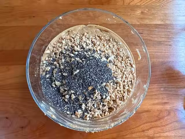 5、倒出來加入花生碎和奇亞籽拌一拌;