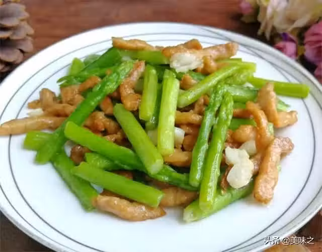 6、放入蒜末、蘆筍翻炒,加鹽調味。