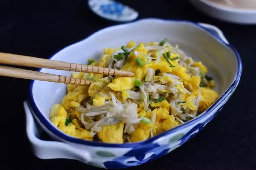 3、然後鍋裡面爆香蔥白,先放入金針菇翻炒下,然後淋入蛋液,等稍微定型了再繼續翻炒,最後撒入蔥段即可。