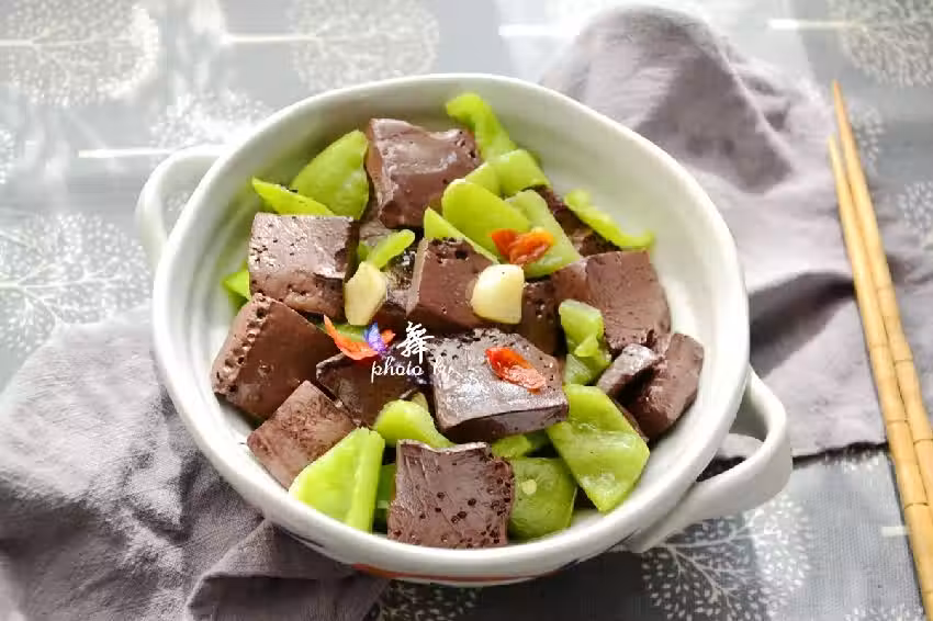 豬血1塊 青椒適量 鹽和料酒少許 蒜末適量