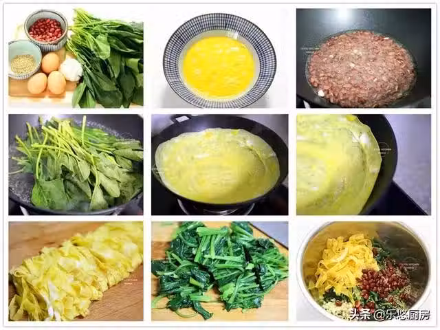 第九步:取一盆,依次放入切好的菠菜、蛋皮、花生米、蒜末、熟白芝麻,再放入1勺鹽、少許雞精、2勺香醋、少許香油拌勻。